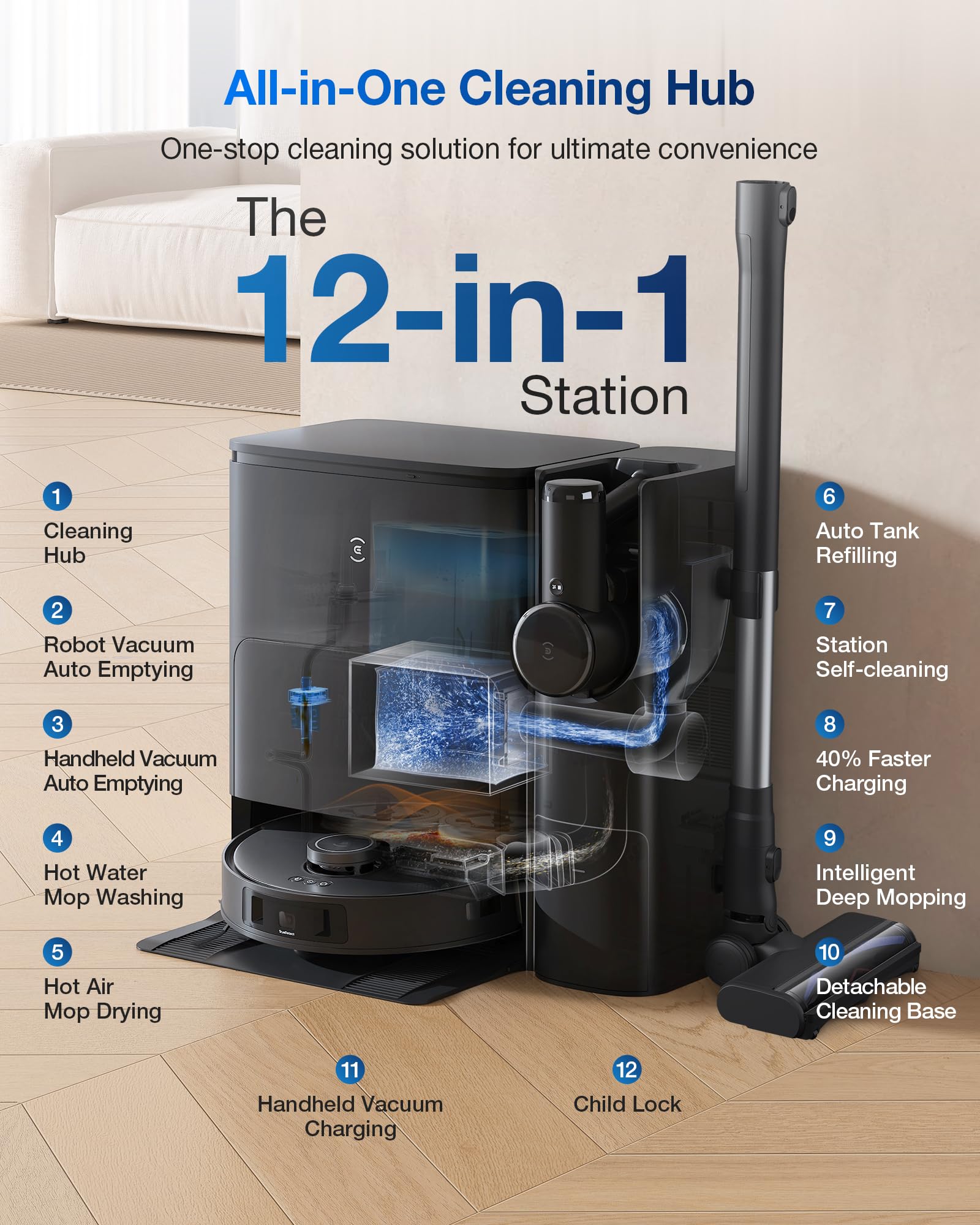 1, Automated dust collection with 3L dust bags for both the robotic cleaner and handheld vacuum.