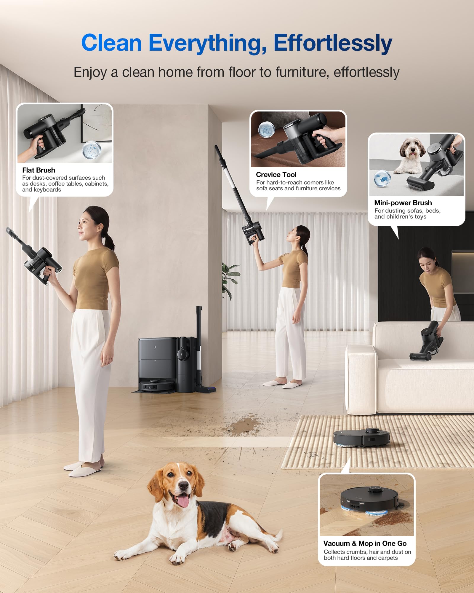 The DEEBOT T30S COMBO COMPLETE revolutionizes cleaning with its innovative design, seamlessly combining a handheld vacuum cleaner with the OMNI station for dust collection. It comes with an extension hose and Zero Tangle Power Brush to cover every corner and surface in your home.